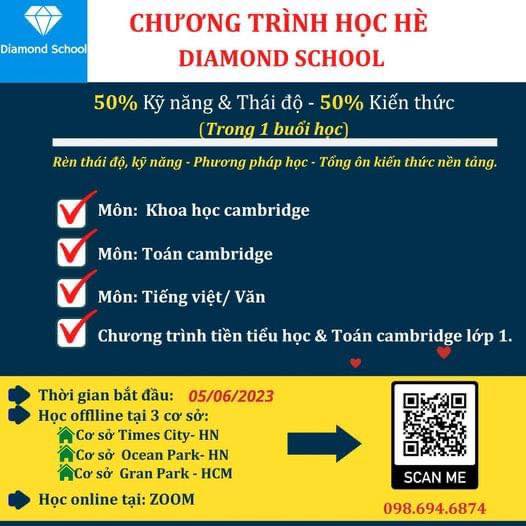 Ba mẹ ơi, kỳ nghỉ hè của các con đã đến. Thay vì để các con trôi qua một mùa hè không có hoạt động ý nghĩa thì hãy để con tham gia khóa học hè cùng thầy cô Diamond School. Trung tâm luôn tự hào giới thiệu chương trình học chất lượng, mang đến cho các con những thành tích xuất sắc trong học tập. 🥰 🥰